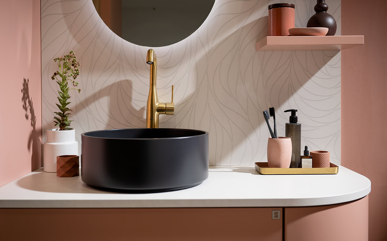 De avrundede skapene våre har smarte oppbevaringsmuligheter. Skapene åpnes med touch-latch, som gjør håndtakene overflødige.