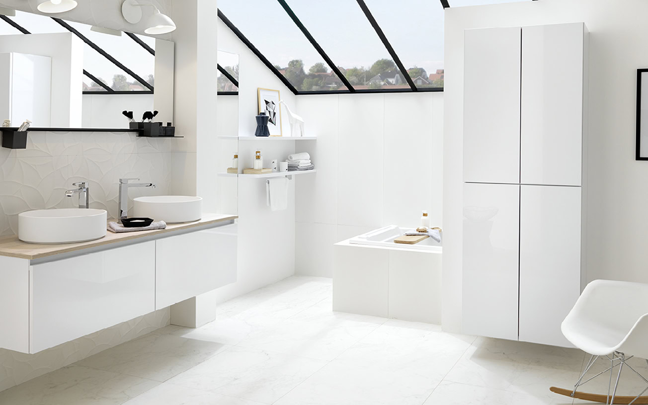 Strass Glossy-baderommet bringer en eksklusiv finish inn i ditt private velvære-rom. Med høyglanslakk på alle synlige flater og matt lakk innvendig oppnås en balanse mellom visuelt drama og praktisk anvendelighet. Den glitrende høyglanslakken forsterker lyset i baderommet og skaper en følelse av dybde og romslighet, mens den innvendige matte overflaten minimerer refleksjoner og letter den daglige rengjøringen.